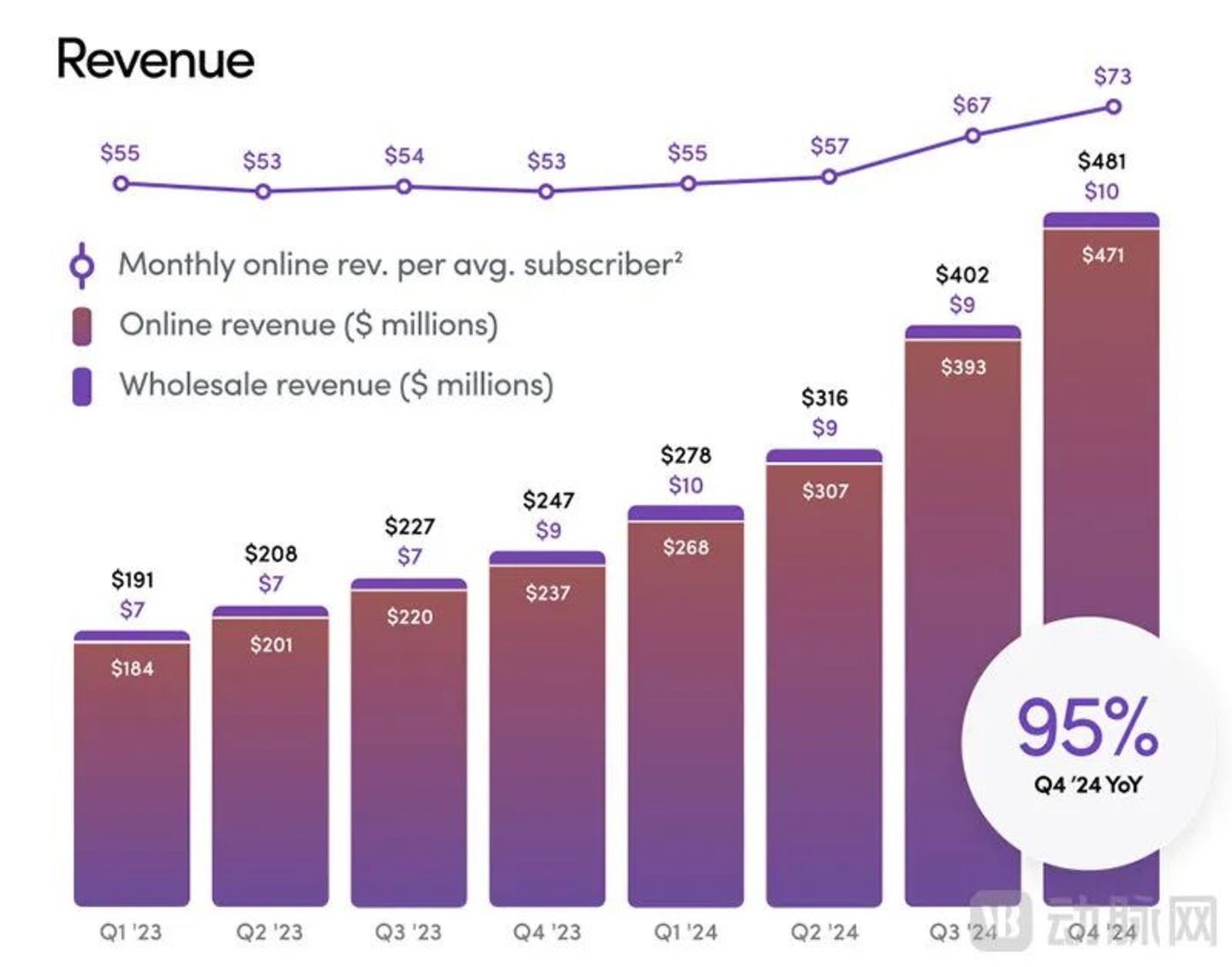 从年报来看,Hims &Hers营收主要依赖于C端。公司营收绝大部分来自在线订阅用户的订阅收入,剩下来自批发业务的营收几乎可以忽略不计。正因为此,订阅用户数量和平均单价对其营收有直接影响。在这两项指标上,Hims &Hers在2024财年都实现了明显提升。
