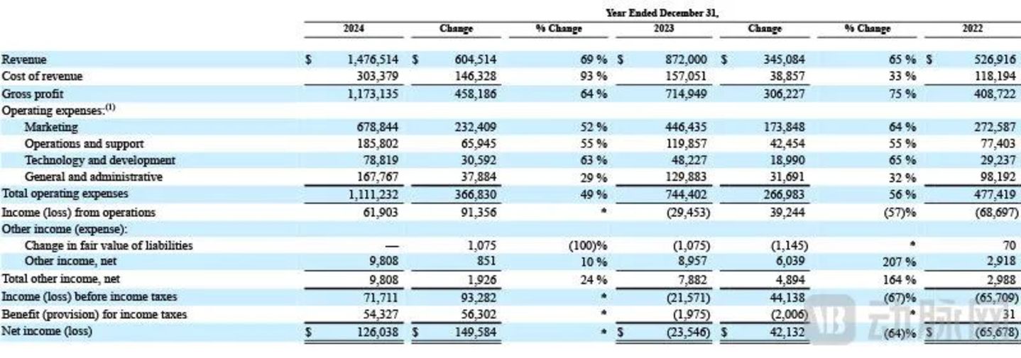 Hims &Hers在2024财年实现的营收增长是如此之大,以至于即使全年总运营成本同样大幅增长49%,依然保证其能在创立7年多后净利润首次为正——从2023财年亏损2354.6万美元到盈利1.26亿。调整后EBITDA则从2023财年的5000万美元狂飙至1.77亿美元,调整后EBITDA利润率则从6%大幅提升至12%。