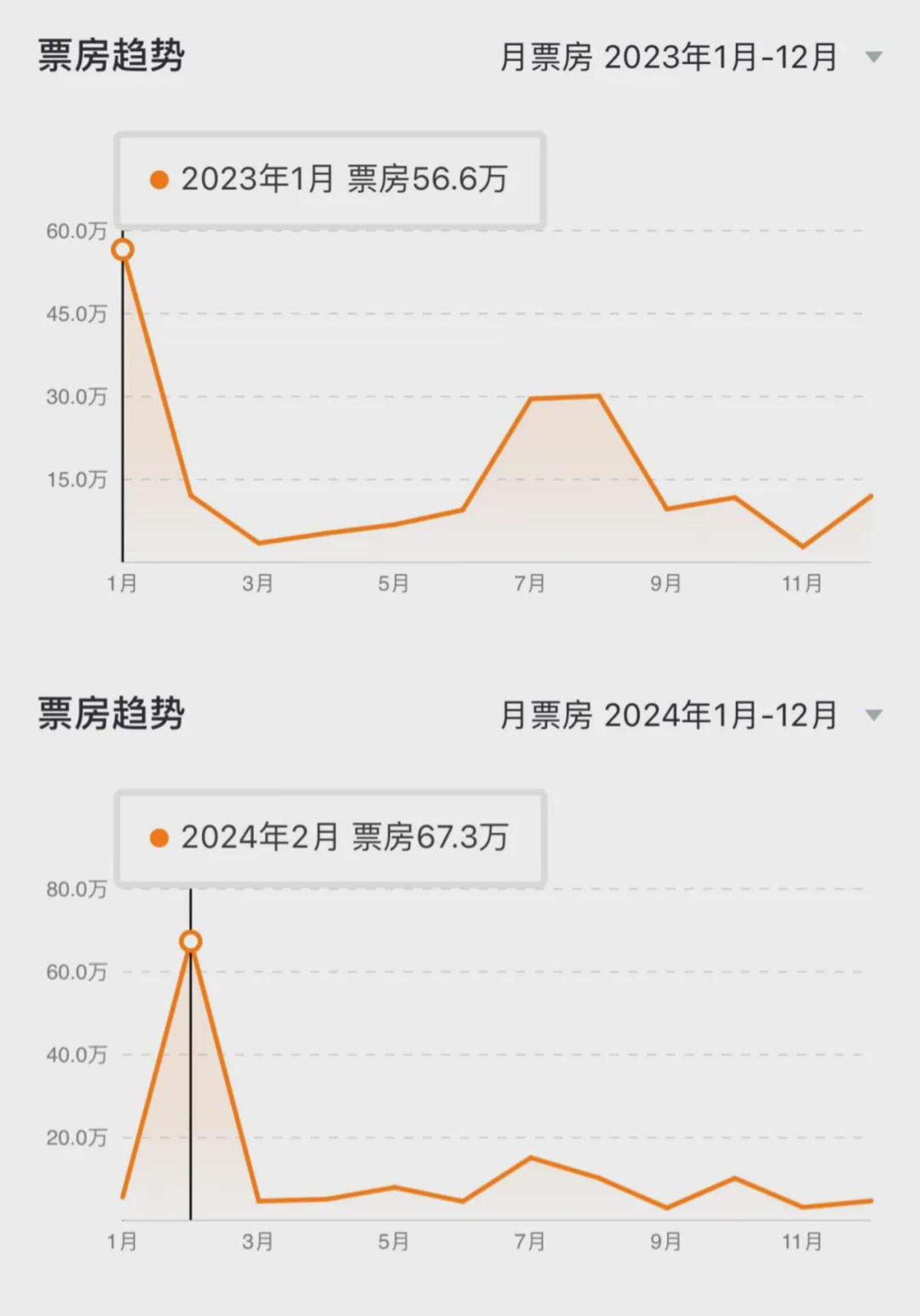 张宁所在的这家影城,也是无数县城影院的缩影:全年票房越来越向头部春节档集中。2023年,该影城全年票房189.5万,1至2月票房只占35%,而2024年全年票房141.9万,1-2月票房已经占到50%。