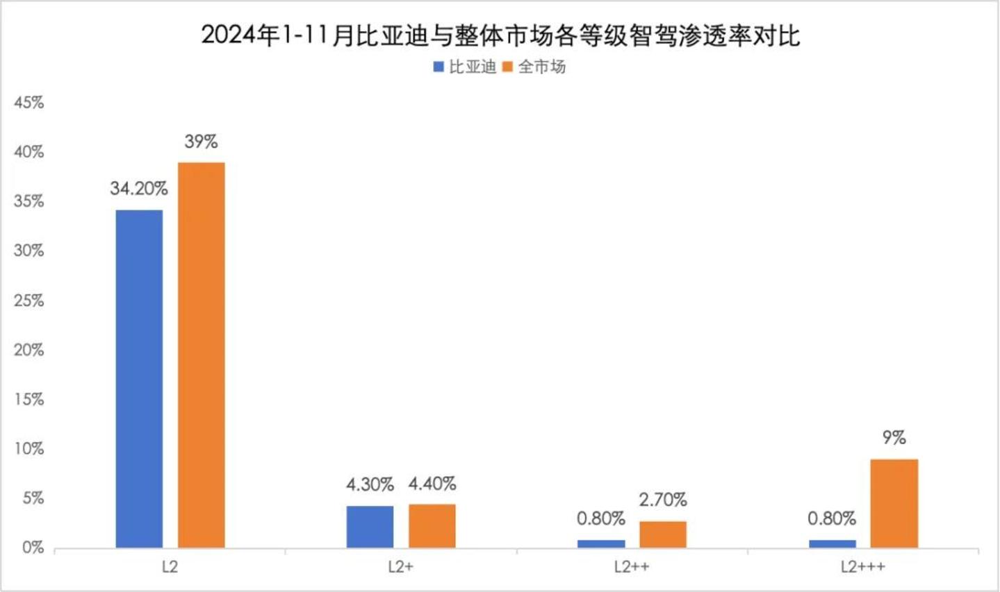有机构调研甚至显示,在完成新款切换后,比亚迪今年高阶智驾车型出货量可达200-250万辆。尤其是L2++和L2+++更高级别的份额,由于此前布局晚,比亚迪在该层面与行业水平相比仍有较大提升空间;