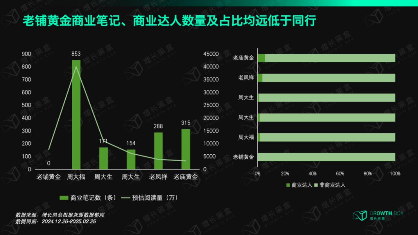 其次,老铺黄金的商业投放十分有限。数据显示,近3个月内,老铺黄金的商业笔记数、商业达人数量为0,几乎没有进行商业投放,而周大福、周生生、老庙黄金、老凤祥等同行却投放动作频频。尽管如此,老铺黄金的预估阅读量和互动总量却超过许多高投放品牌,比如老庙黄金和老凤祥。