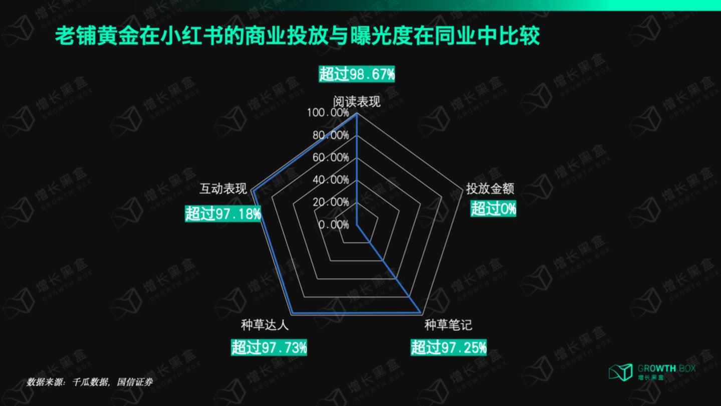 国信证券最新的研报也指出,虽然老铺黄金在小红书上的商业投放金额不及同行,但其在小红书上的种草笔记数量、笔记互动表现、阅读表现却超过了约97-99%的同行。[3]这足以说明,老铺黄金在线上的品牌声量并非花钱投放带来,而是“自来水”。