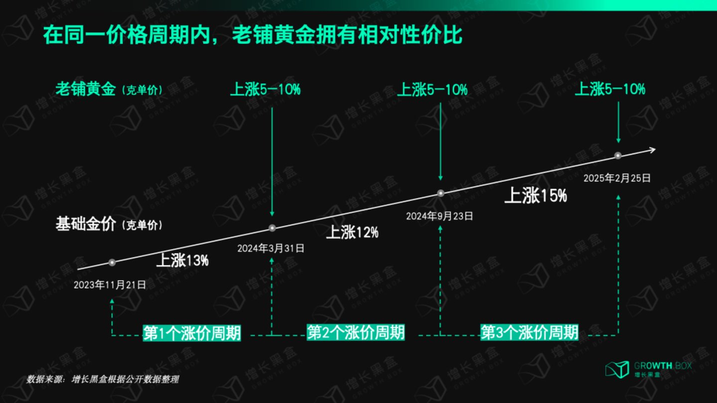 类似的情况也存在于2024.3.31-2024.9.23,以及2024.9.23-2025.2.25这两个周期,基础金价分别上涨12%、15%,而老铺黄金依然维持价格不变,直到某个节点宣布涨价。甚至对比基础金价10-15%的涨幅,老铺黄金5%-10%的涨幅还要更小。