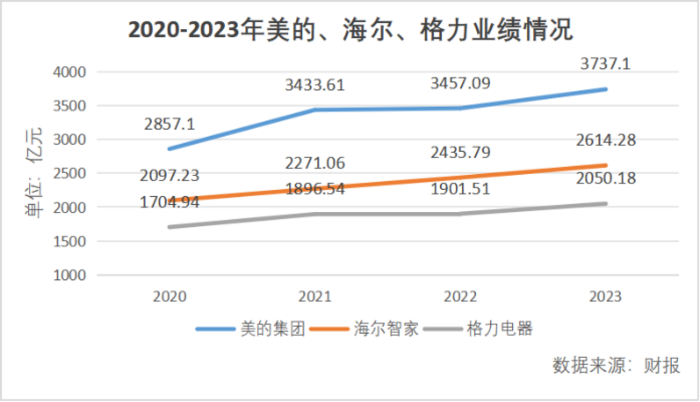 经过多年发展,家电市场已形成美的集团(000333.SZ)、海尔智家(600690.SH)、格力电器(000651.SZ)三足鼎立之势。从近些年三家公司的经营数据可以看出,虽然各自仍在上行通道,但增速逐步趋缓。