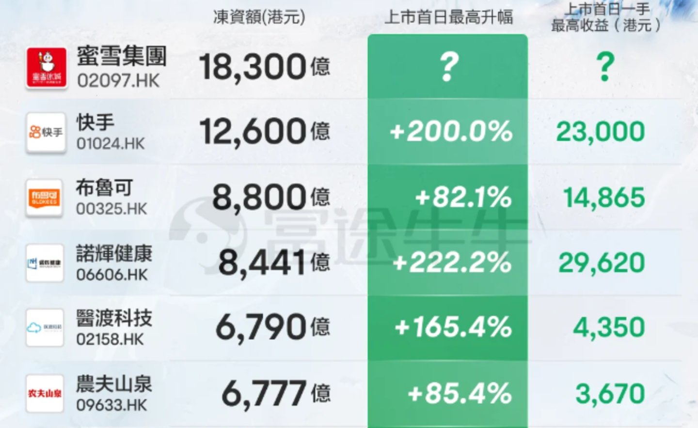 蜜雪冰城于2月21日正式开启招股,计划于3月3日上市。据富途牛牛数据,截至2月26日招股结束,蜜雪冰城在港股公开发售环节融资认购倍数超过5266倍,认购金额达到1.83万亿港元,刷新IPO历史,加冕为新的“冻资王”。3月3日,蜜雪冰城首日大涨超43%,不负众望。