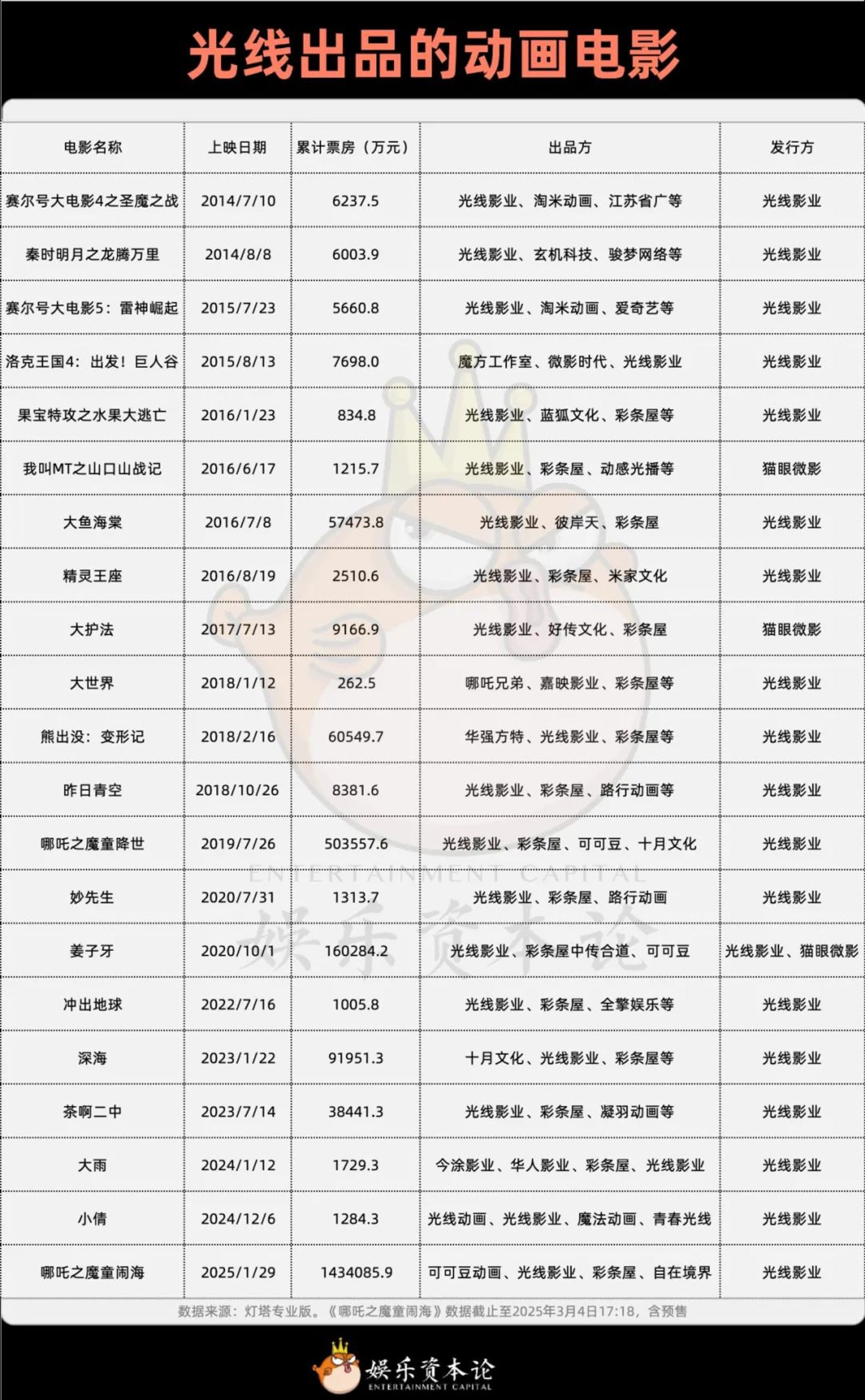 王长田和光线一直是业内“抠门”的代表,但光线并不只有成本控制。从发行开始一步步走到行业的最上游,光线对于全流程把控的重视程度不应被低估。