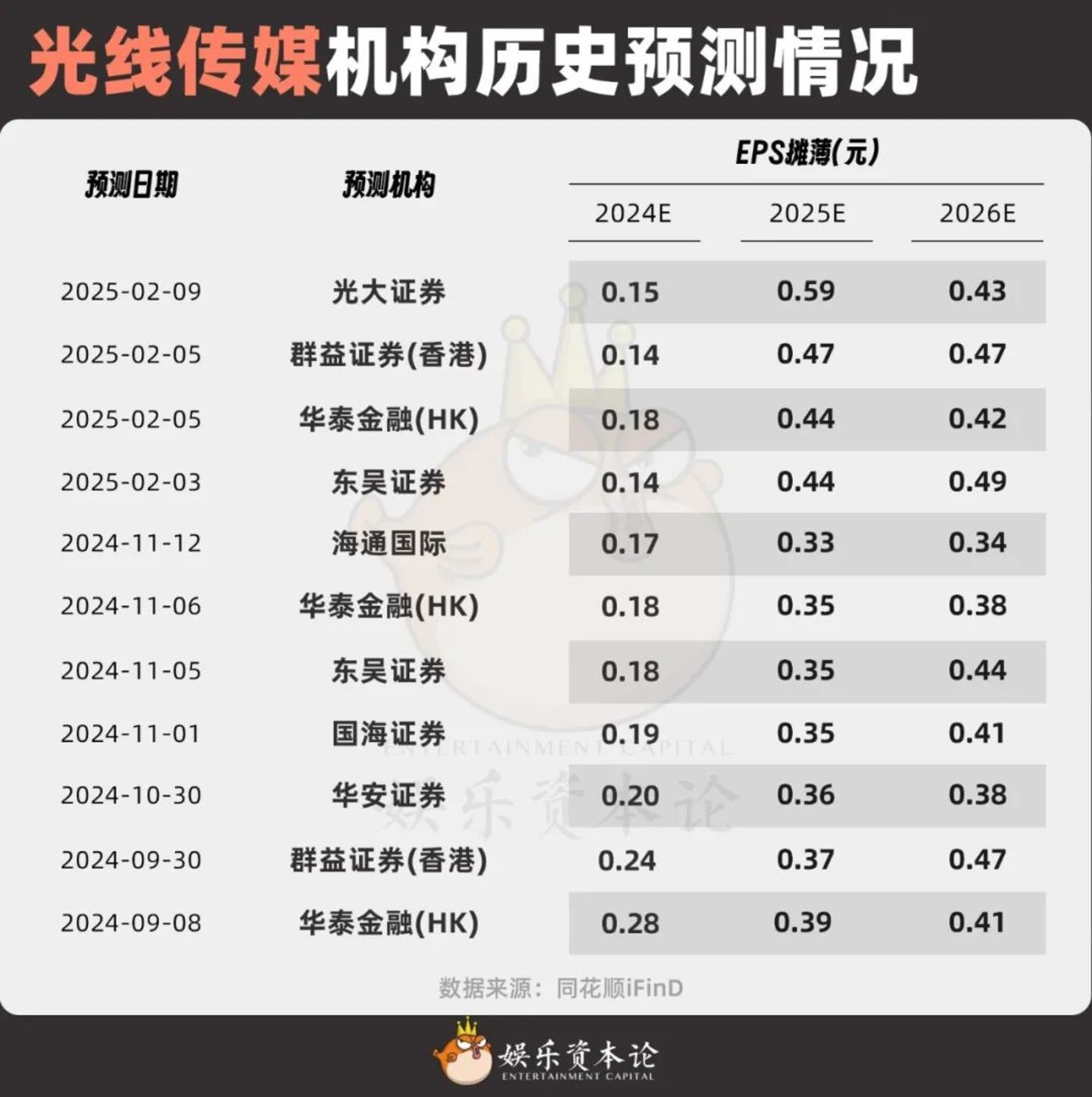 光线传媒机构历史预测情况
