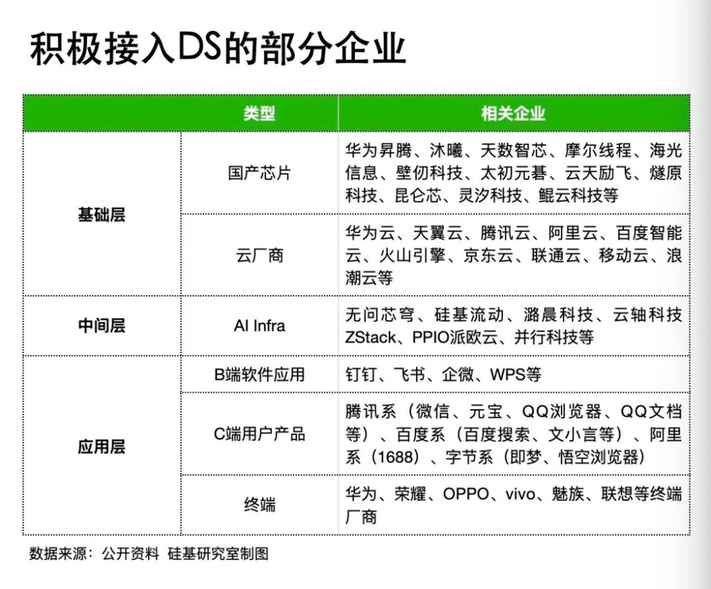 而从DeepSeek的「朋友圈」中来看,表现最为积极、速度最快的可以分为四类玩家:基础层(包括国产芯片厂商、云厂商)、中间层(AI Infra厂商)以及在B、C两端的软、硬件厂商。