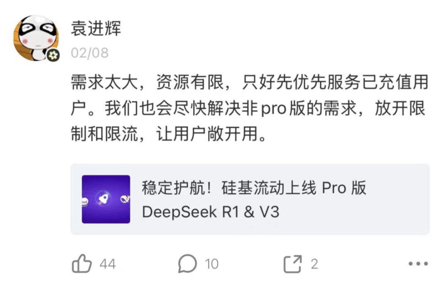 硅基流动袁进辉宣布因需求大开始限流
