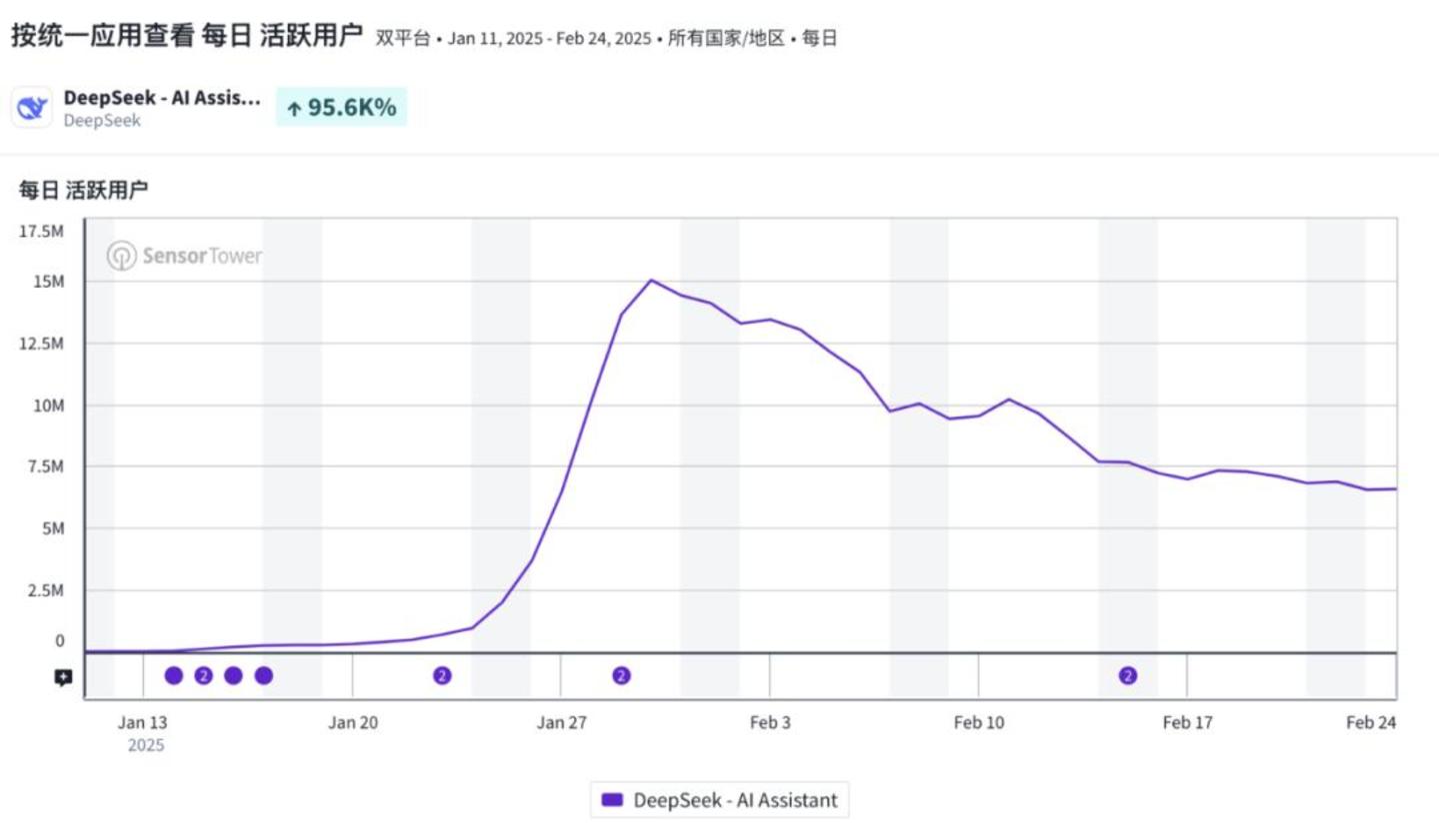 Sensor Tower的数据显示,截至2月24日,DeepSeek移动端的日活数据,已由超过1500万的峰值,下滑至700万左右。与之对应的是,元宝、豆包、通义等均实现了访问量和日活的大幅增长。