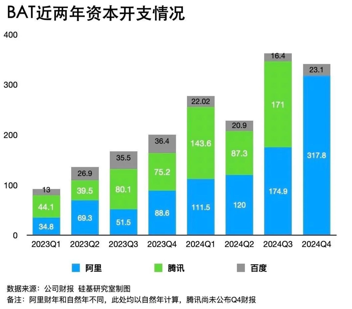 以阿里和百度为例,2024年全年,阿里资本支出总计超724亿元,百度超82亿元,据《财经》此前报道,阿里、字节跳动也早已完成10万卡级别的算力储备。