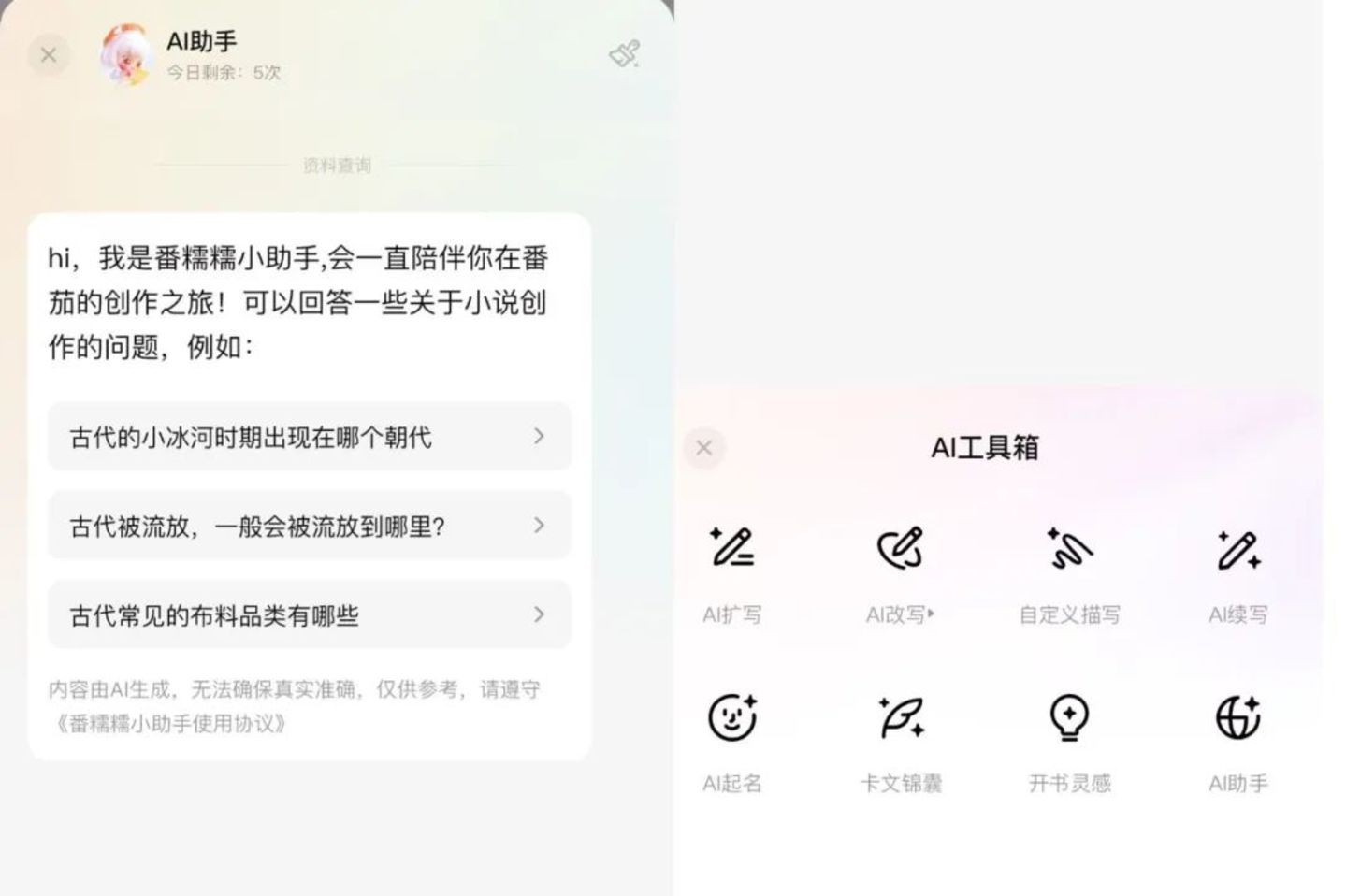 而在DeepSeek出圈后,阅文也宣布旗下作家辅助创作产品——作家助手已集成独立部署的DeepSeek-R1,阅文称将大幅增强作家助手的问答推理能力和描写润色效果,中文在线旗下创作大模型「中文逍遥」也宣布部署DeepSeek。以番茄作家助手为例,进入开书页面,输入想法,AI能为创作者提供多个灵感参考,在具体写作过程中,平台也提供了AI工具箱——包括了AI扩写、AI润色、AI续写、AI助手等。