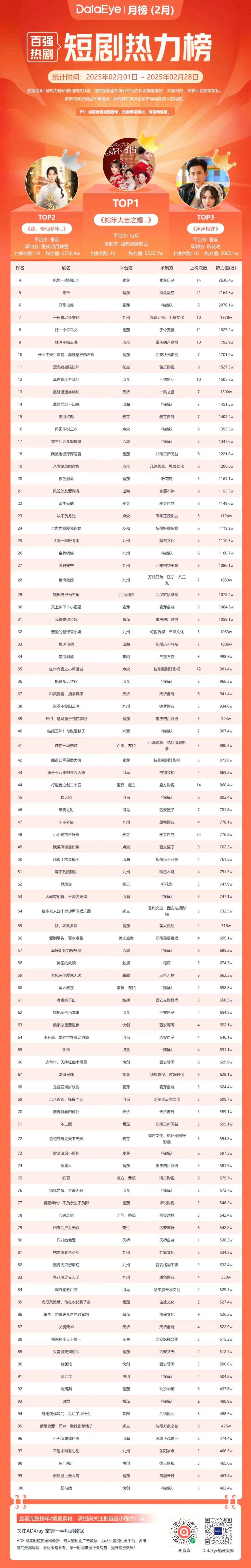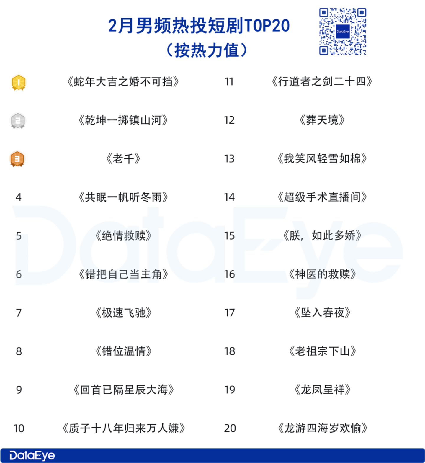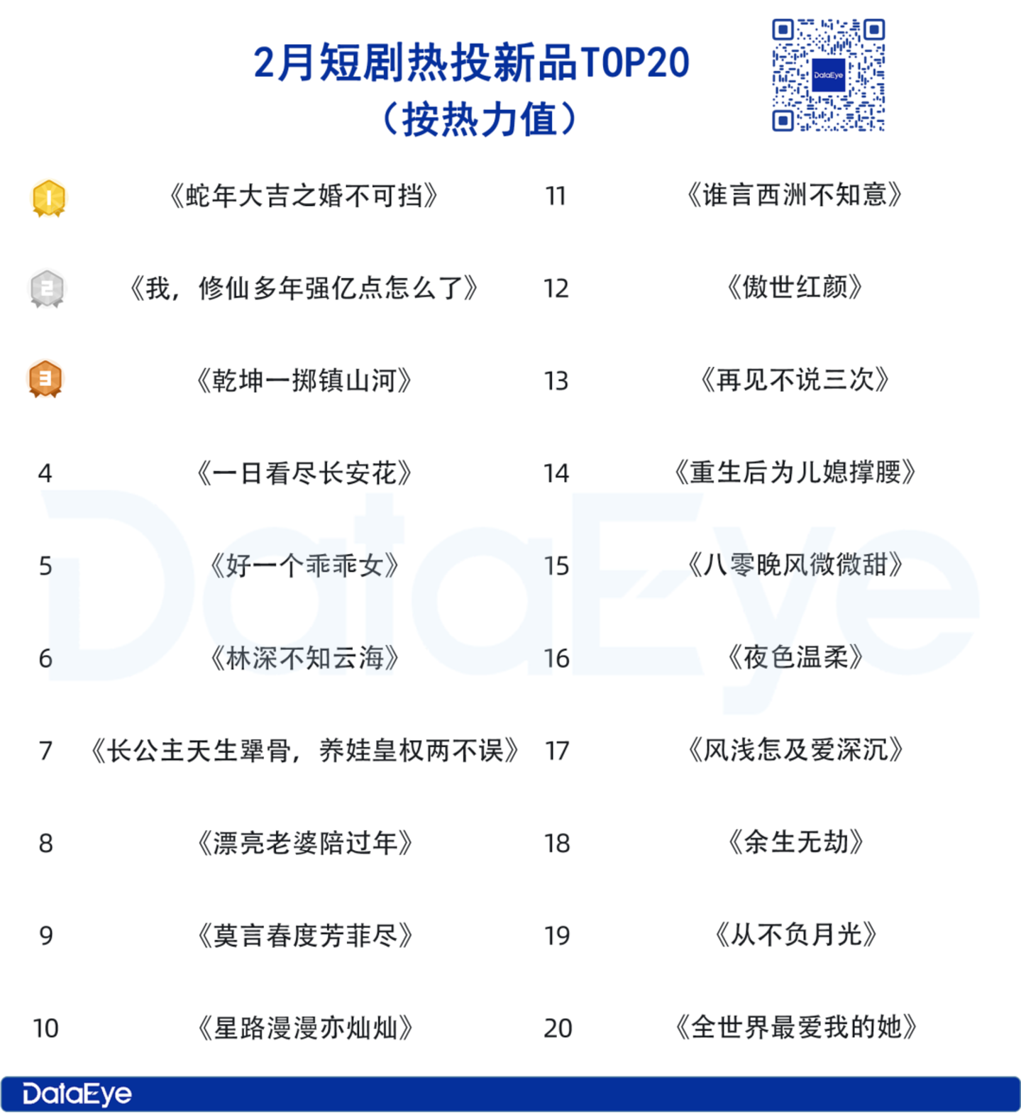 2月DataEye短剧新品榜(按热力值),点众《蛇年大吉之婚不可挡》登顶,番茄《我,修仙多年强亿点怎么了》第二,麦芽《乾坤一掷镇山河》位列第三。