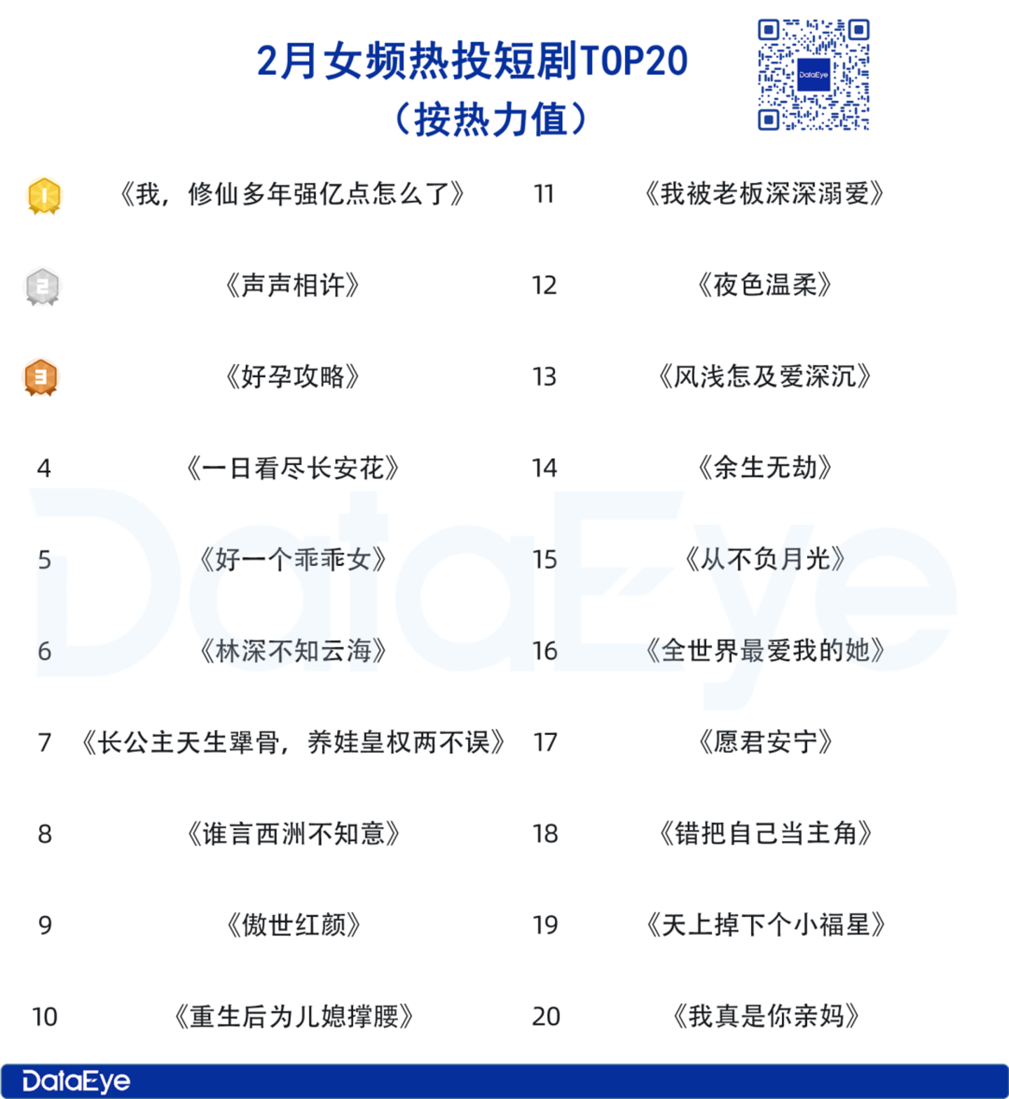 2月女频热投短剧中,番茄《我,修仙多年强亿点怎么了》登顶,番茄《声声相许》第二,麦芽《好孕攻略》位列第三。其中,共有17部新剧闯入本月女频热投TOP20。