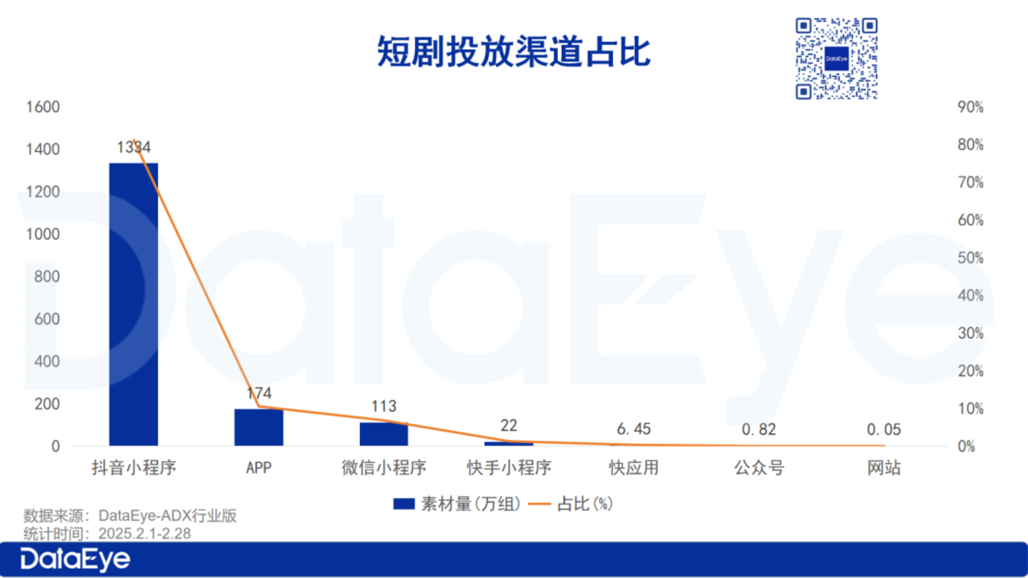 2月短剧投放渠道中,抖音小程序位列第一,APP第二,微信小程序第三,快手小程序和快应用分别是第四和第五。另外,DataEye-ADX行业版增加了网站投放渠道的素材抓取,但占比较少。