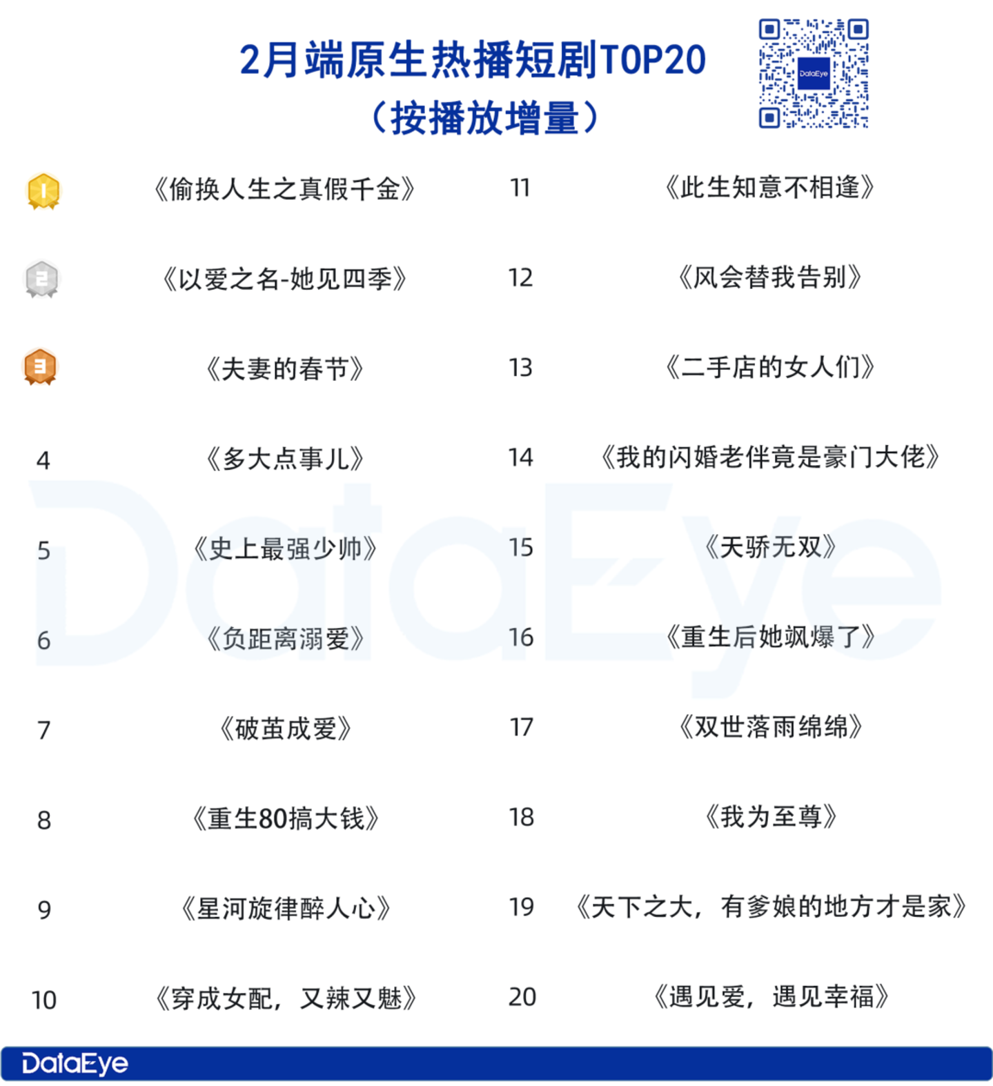 2月DataEye端原生热播榜中,女王短剧播出的《偷换人生之真假千金》蝉联榜首,她见四季播出的《以爱之名-她见四季》第二,她的世界播出的《夫妻的春节》位列第三。