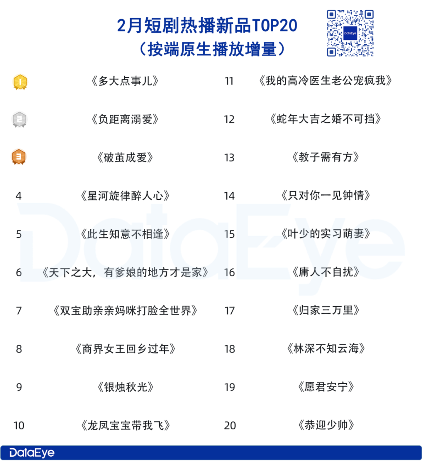 2月DataEye端原生热播新品榜中,马厩制片厂剧场号播出的《多大点事儿》登顶,柚子时光剧场播出的《负距离溺爱》第二,沐沐短剧播出的《破茧成爱》第三。