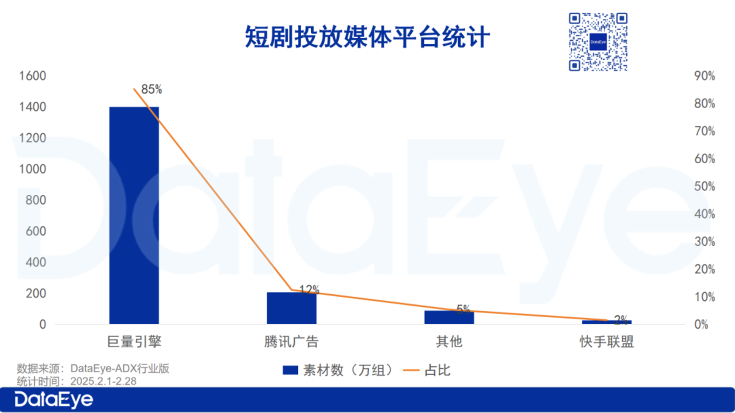 总体来看,2月短剧投放方面,整体素材投放量环比上期略有下降,下降量主要在巨量引擎的抖音小程序上。一方面是因为2月较1月仅有28天,且有4天为春节假期,投放量受时间因素影响有所减少。春节期间,投放团队和受众都处于休假状态,导致投放节奏放缓。另一方面,经过1月的大规模投放,市场在一定程度上已趋于饱和,受众对短剧的新鲜感有所降低,投放效果出现边际递减效应,使得投放方更加谨慎地控制投放规模和节奏。