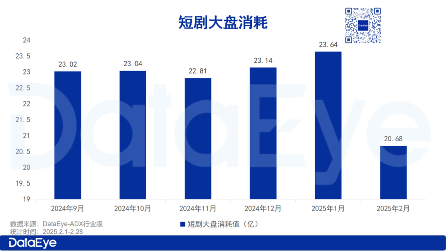 据DataEye短剧观察统计,2月短剧大盘共消耗20.68亿,较1月下降了2.96亿,环比下降12.52%。近4月以来,首次出现下降趋势。