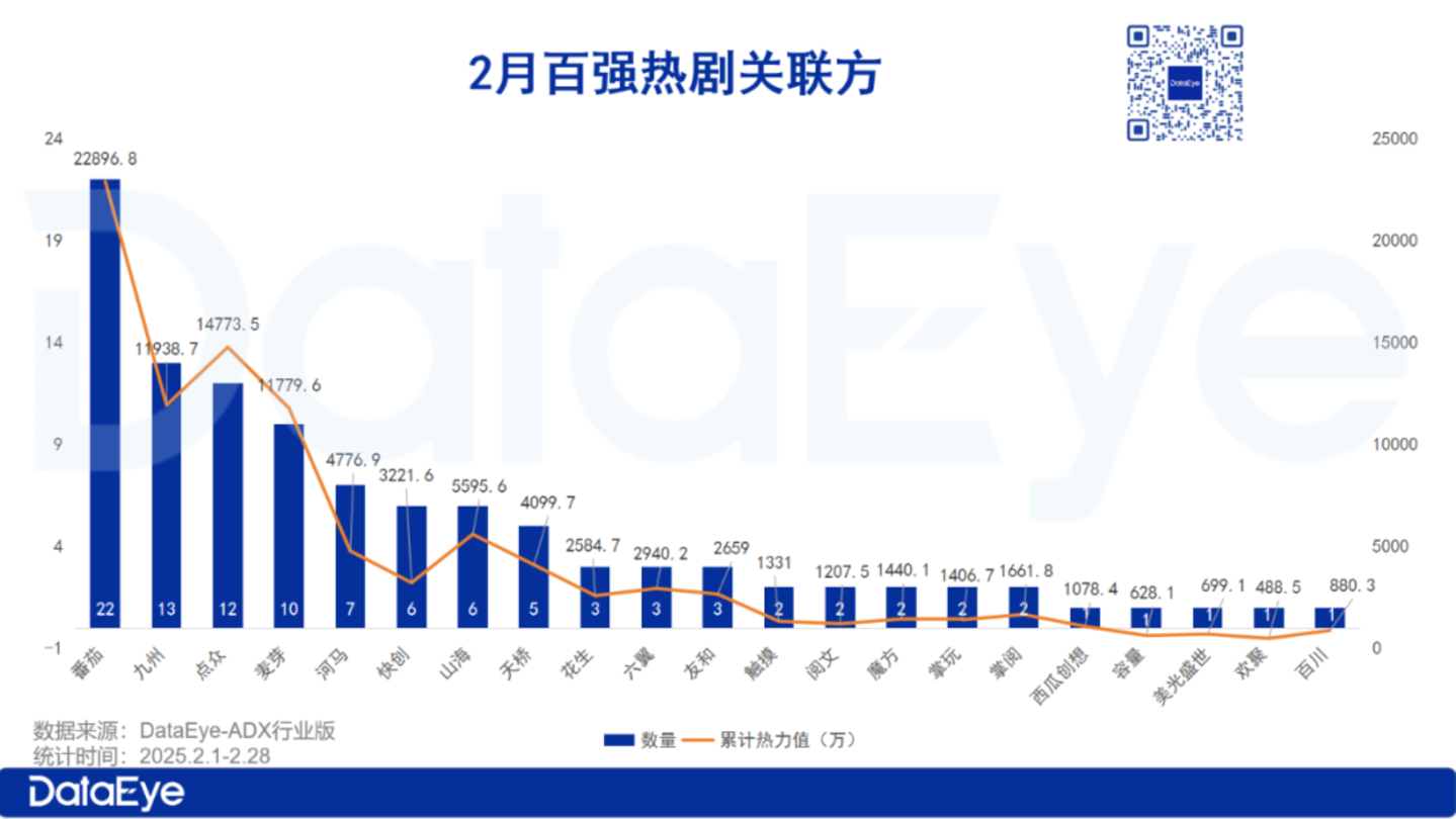 从关联方来看,番茄、九州、点众、麦芽、河马、山海、快创、天桥等公司表现较为活跃,2月DataEye短剧热力榜百强榜中,番茄断崖领先占22席,九州占13席,点众占12席,麦芽占10席,河马占7席,快创和山海均占6席。