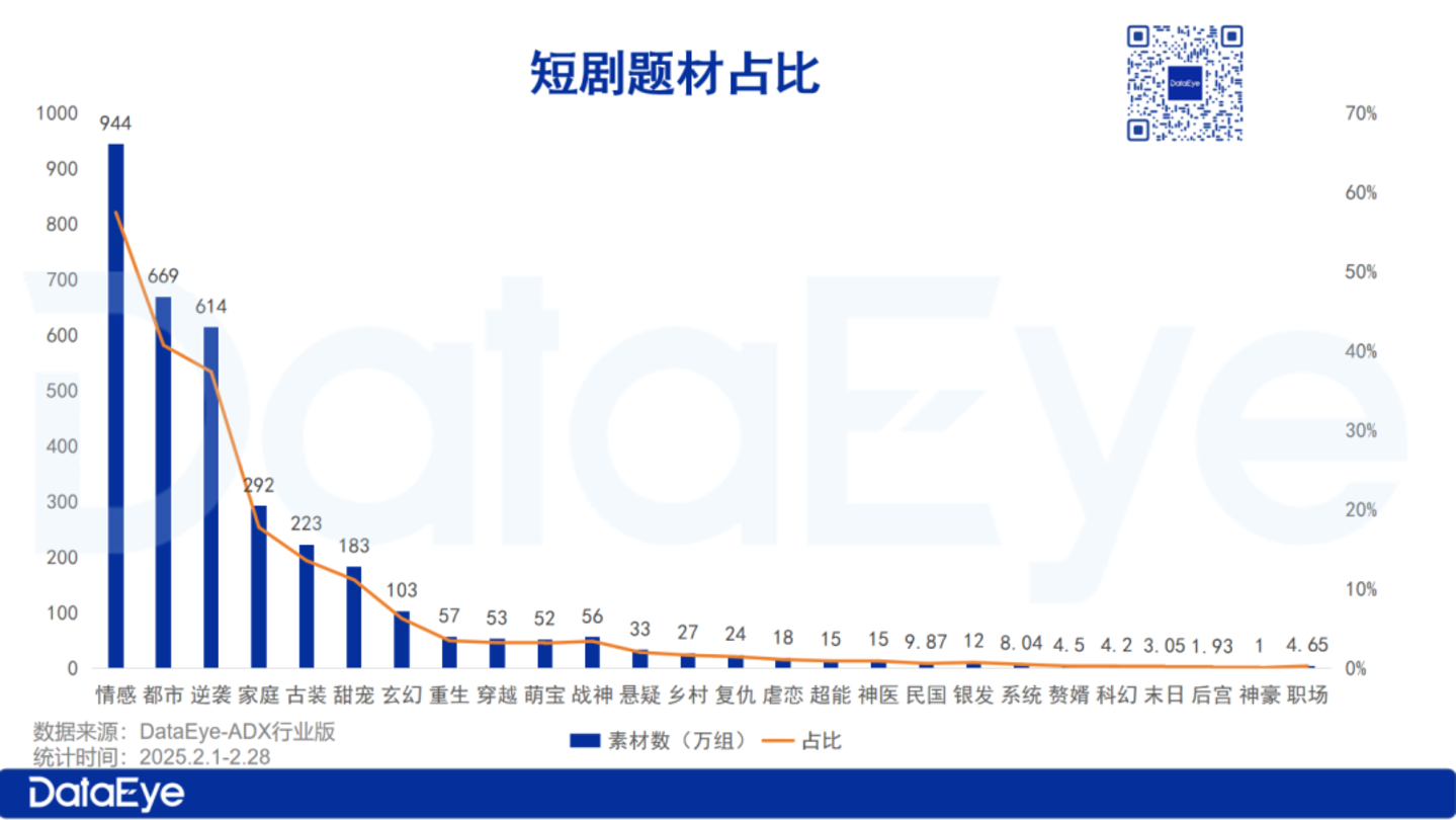 而从细分题材来看,情感、都市、逆袭题材包揽TOP3,投放素材数分别为944万组、669万组和614万组。