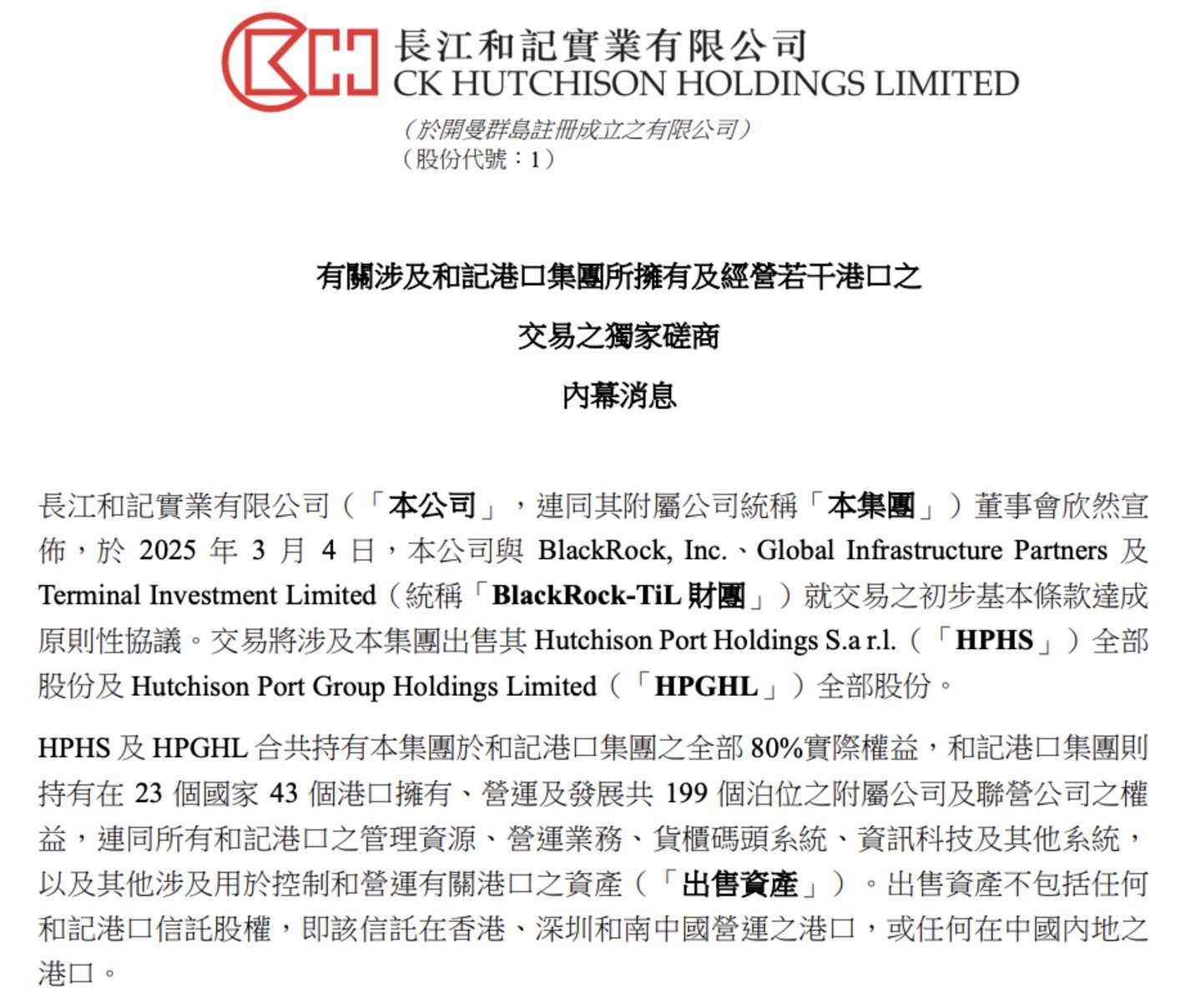 在公告中,长和集团还强调,其将保留中国香港、深圳及内地港口资产,包括盐田国际、香港国际货柜码头等战略资产。