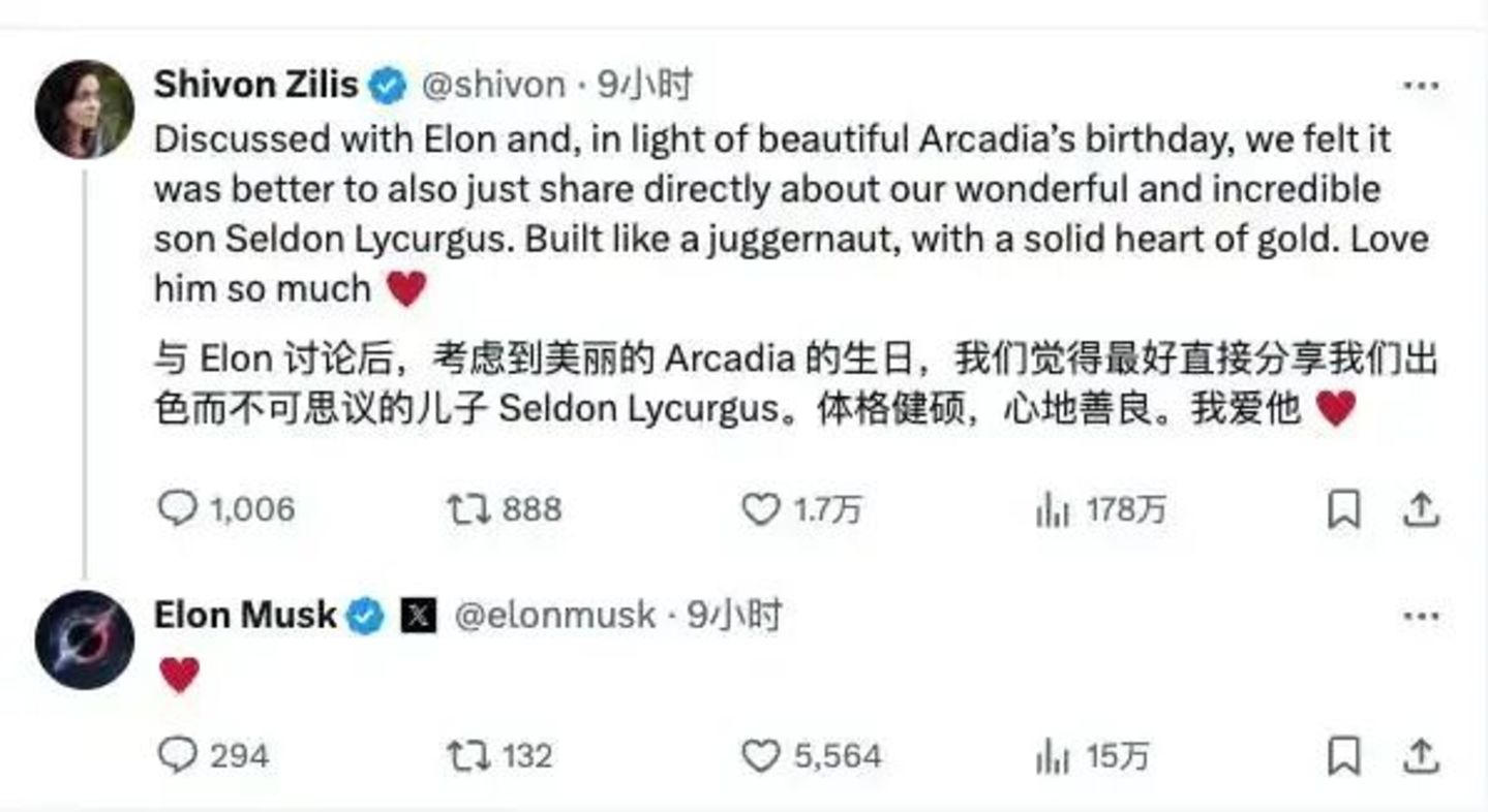 当地时间2月28日,马斯克旗下 Neuralink 公司的高管希冯·齐里斯(Shivon Zilis)在社交媒体X上发文,公布她与马斯克的第四个孩子Seldon Lycurgus的存在。马斯克随后在评论区发了一个爱心的表情以示确认。