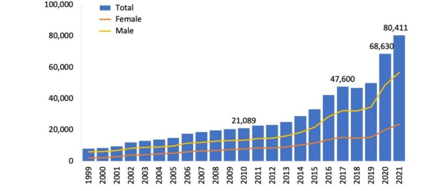 据统计,2000年—2020年期间,美国因阿片类药物过量死亡人数超过50万;每年因为阿片泛滥而导致的开支约在530亿到720亿美元之间。