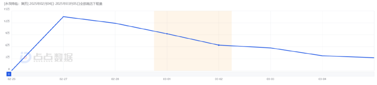 点点数据显示,截止至3月5日《永夜降临:复苏》6天单iOS平台预估下载量超53.7万次(含2月27日预下载数据)。