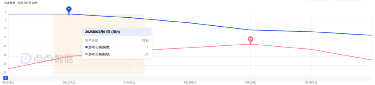 点点数据显示,《永夜降临:复苏》开启预下载后,连续三天登顶iOS免费榜,上线首日来到iOS畅销榜第32名,截至发稿前iOS畅销榜最好成绩为18名。