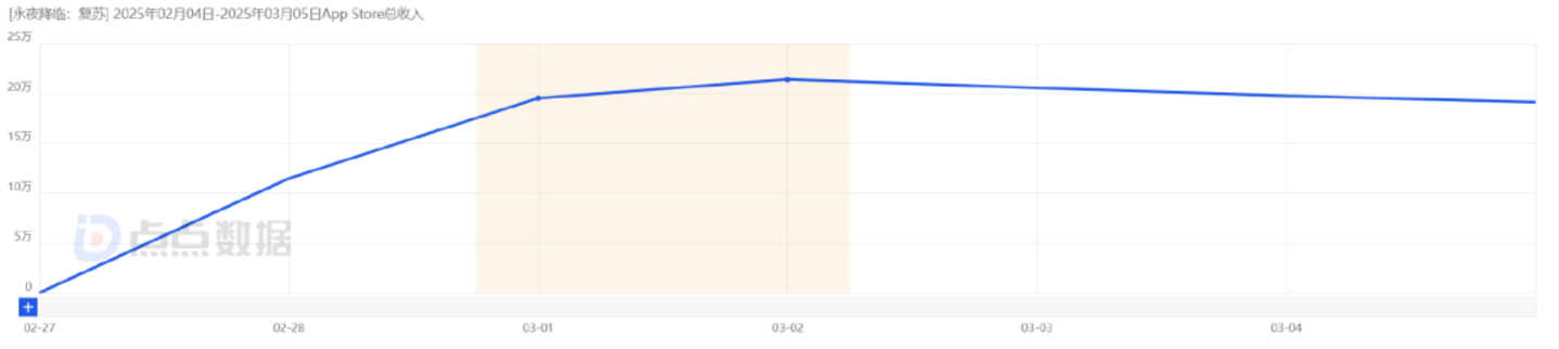 点点数据显示,截止至3月5日《永夜降临:复苏》6天单iOS平台的预估收入超815万元(扣除平台分成)。