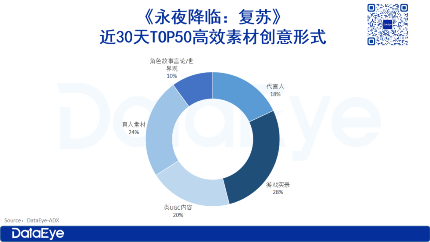 《永夜降临:复苏》最多计划使用的TOP50视频素材内容中,占比最高的是游戏实录为28%,其次是真人素材24%,类UGC素材占比20%。