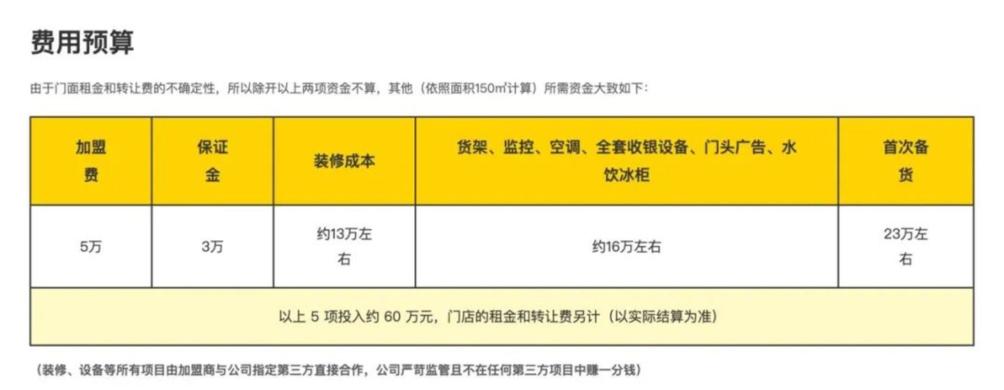 在这项成本预算表中,首次备货预算需要23万元左右,但面对几千个SKU(最小库存单位),也是对加盟商配货眼力的高度考验。有加盟商曾接受媒体采访表示,真正热销的单品相对集中,大部分商品都处于压货的状态,回本周期被加倍延长。