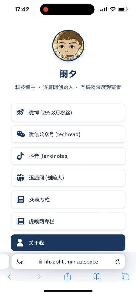 首先我让它帮我做一张linktree风格的个人主页,Manus把这个任务拆成了8个步骤,先在全网搜集我的资料信息,包括我在各个平台的链接以及代表作,然后基于linktree的设计风格开始编写网页代码,半个小时之后,它交付了这么一个作品给我。
