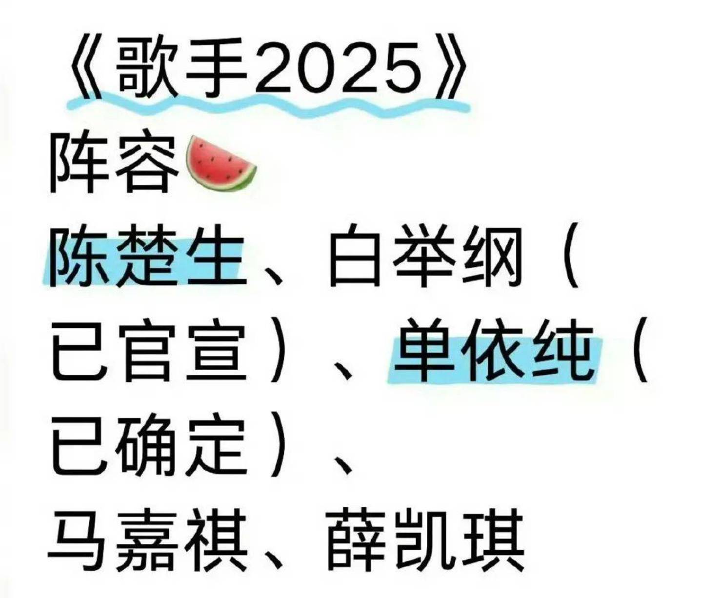 前些天,#歌手2025网传阵容# 话题突降微博热搜,热门名单版本包括了陈楚生、白举纲、单依纯、马嘉祺、薛凯琪,敢情这不还是近年音综常客的排列组合嘛,难怪名单一出“乐坛药丸”的声音又此起彼伏。