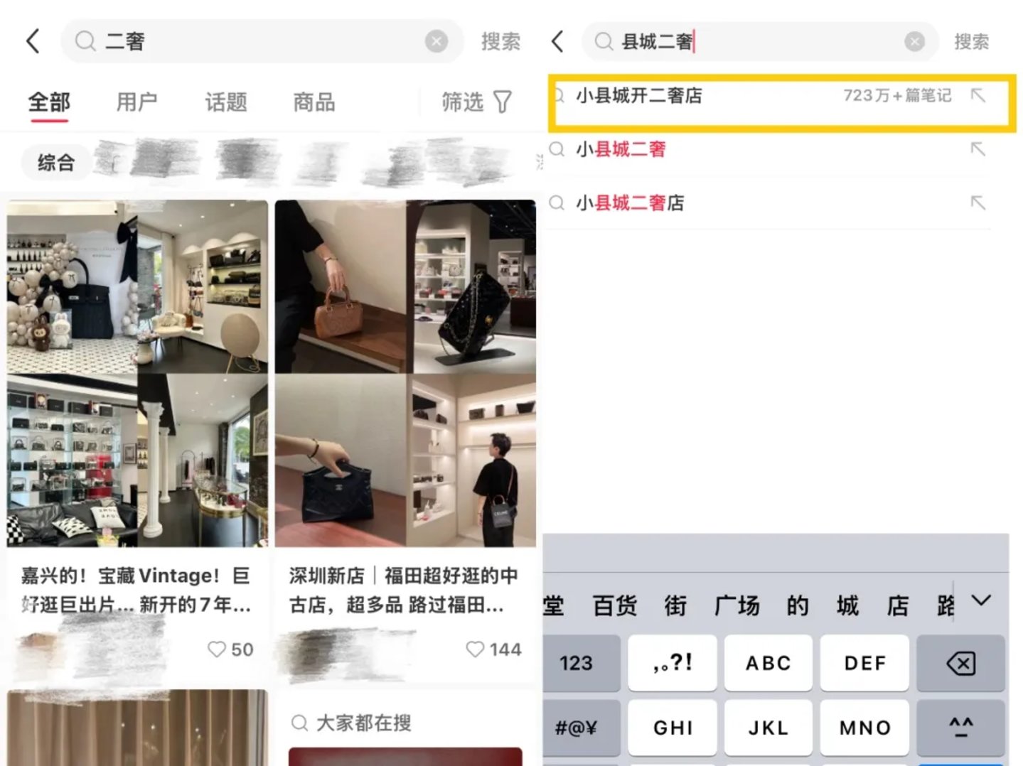 而在小红书上,关于“二奢”、“中古包包”的笔记超过350万篇,笔记的类型涵盖了日常穿搭、包包安利和购买经验分享等。比这些笔记热度更高的是,“小县城开二奢店”的话题已经有723万篇笔记,不少二奢从业者捕捉到了这股风向,想要抓住“县城贵妇们”的心。