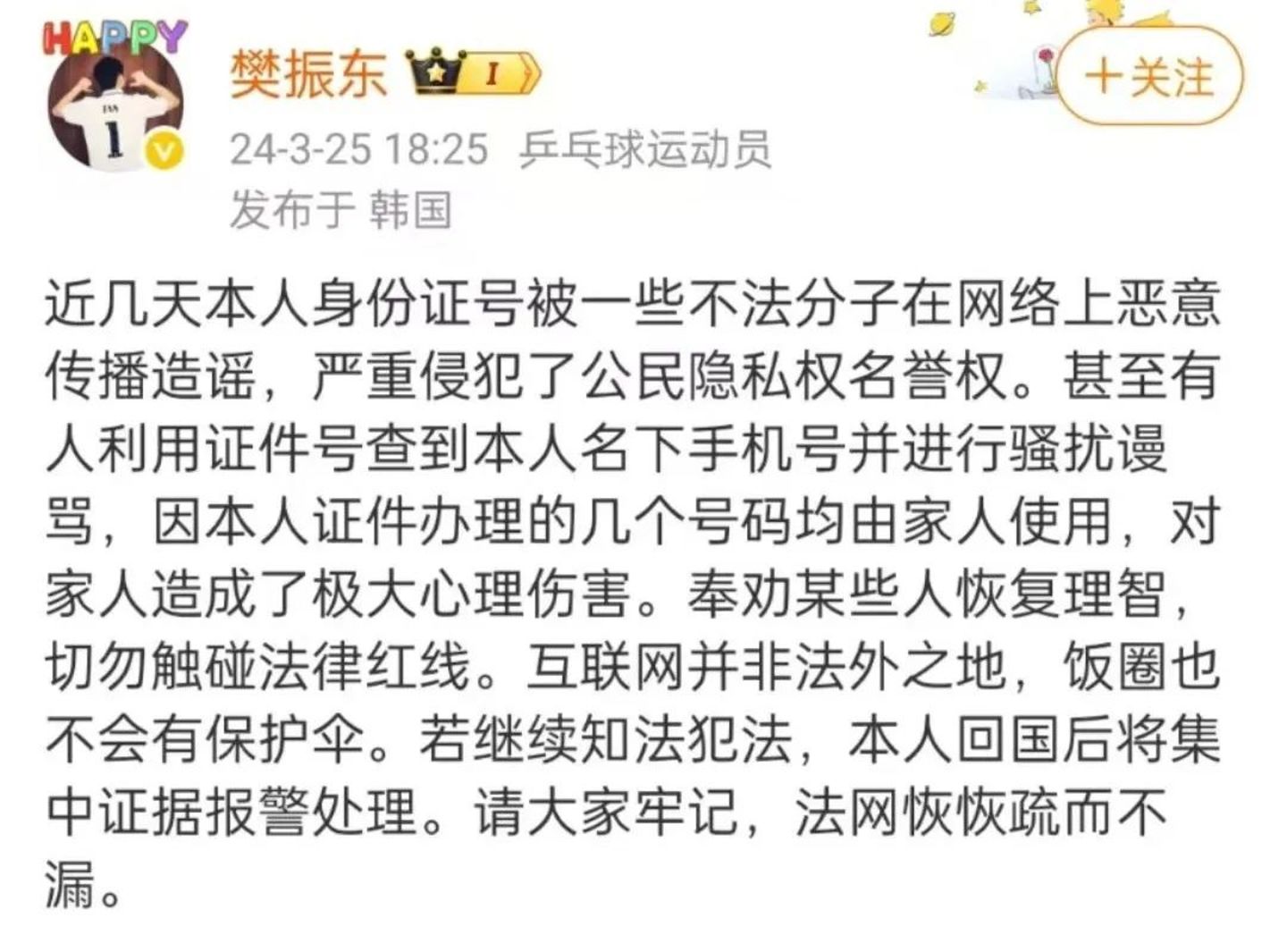 此前,樊振东也遭遇过粉丝送机引混乱、被“私生饭”跟踪多日甚至非法入侵酒店房间等事件。去年3月,樊振东的个人身份证号和手机号又被曝光,给樊振东及家人生活带来了极大困扰。樊振东也曾多次公开表态:不要把饭圈陋习带进竞技体育。