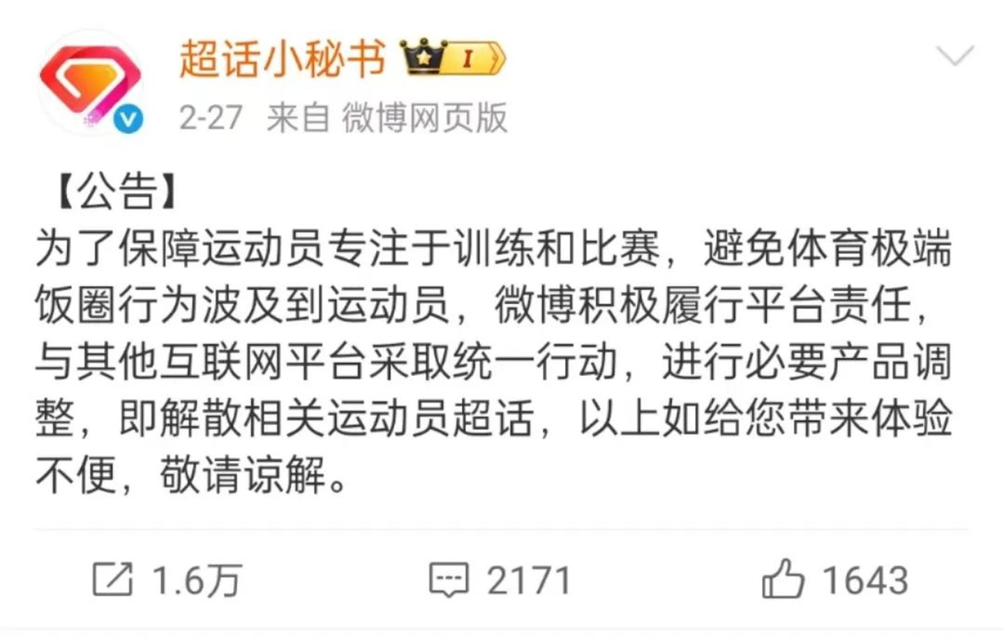 力度不可谓不大,延续性不可谓不强,但该在的群体仍在,每逢大赛来临便再如雨后春笋般冒尖。此次超话的关闭,是否能起到根本性作用,仍然悬而未决。