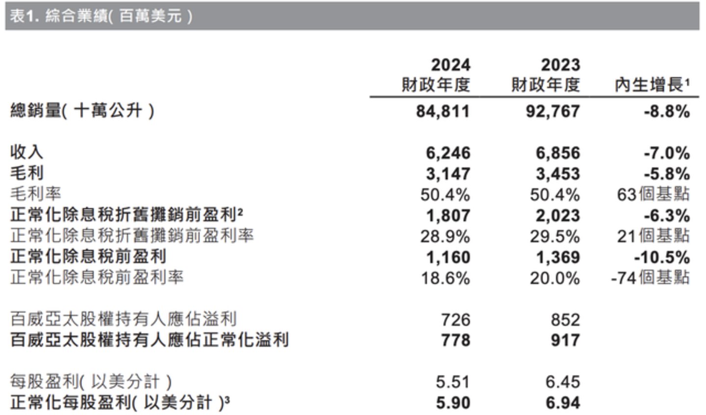 2月末,百威亚太披露了2024年财报,财报显示,2024年公司销量848.1万千升,同比下降8.8%;营收62.46亿美元,同比下滑8.9%;净利润为7.26亿美元 ,同比下滑15.2%。