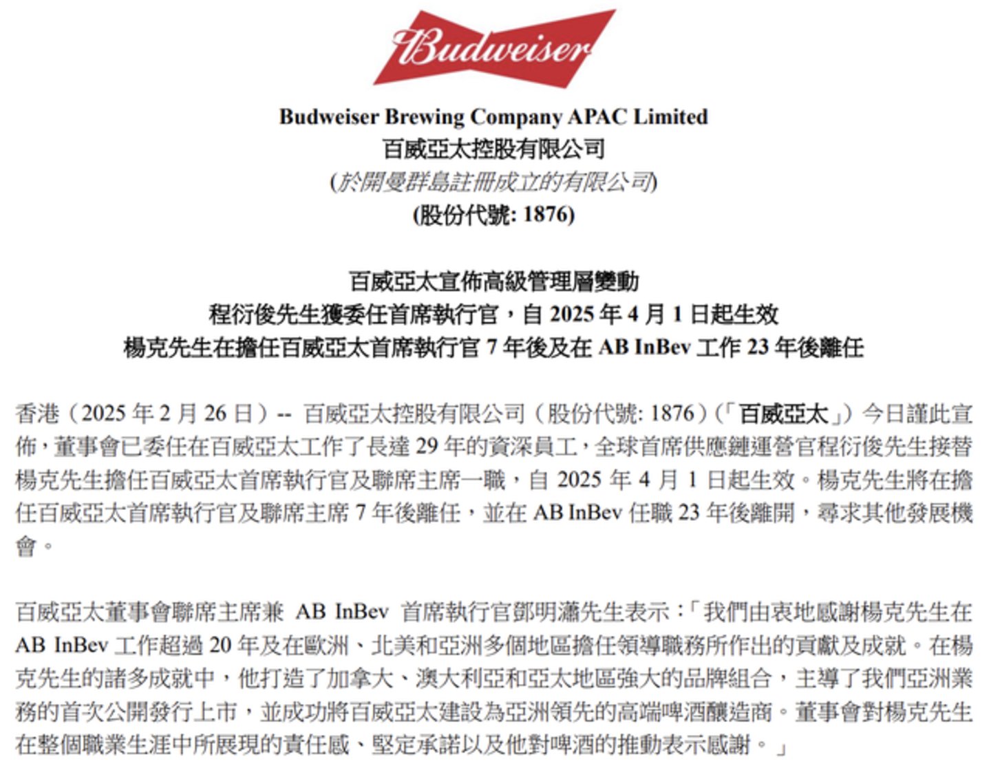 百威亚太的业绩,着实让这家啤酒巨头难堪。近期,百威亚太董事会宣布,杨克即将离任且离开百威亚太,并委任在公司工作29年的资深员工、全球首席供应链运营官程衍俊接任首席执行官及联席主席,该任命自2025年4月1日起生效。