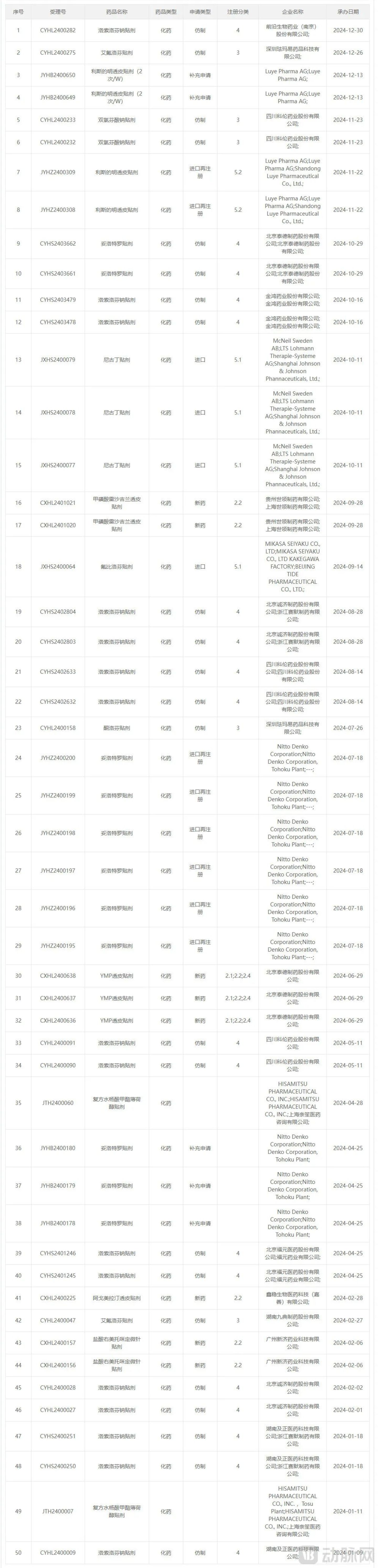 据NMPA的数据,截至2025年3月6日,已有17款透皮贴剂提交上市受理申请,而2022年全年也仅有22款产品。值得注意的是,2024年全年有51款产品提交申请,可见的将来市场会有巨大的变动。