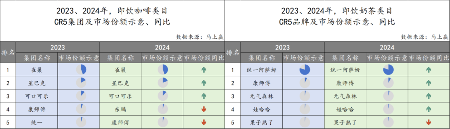 基于马上赢品牌CT的数据,即饮奶茶类目CR5品牌的市场份额从2023年的94.83%上升到2024年的95.91%;而即饮咖啡CR5品牌的市场份额则从84.32%上升到85.35%。