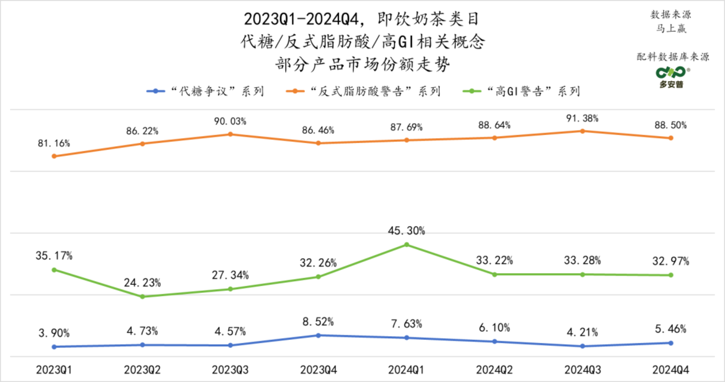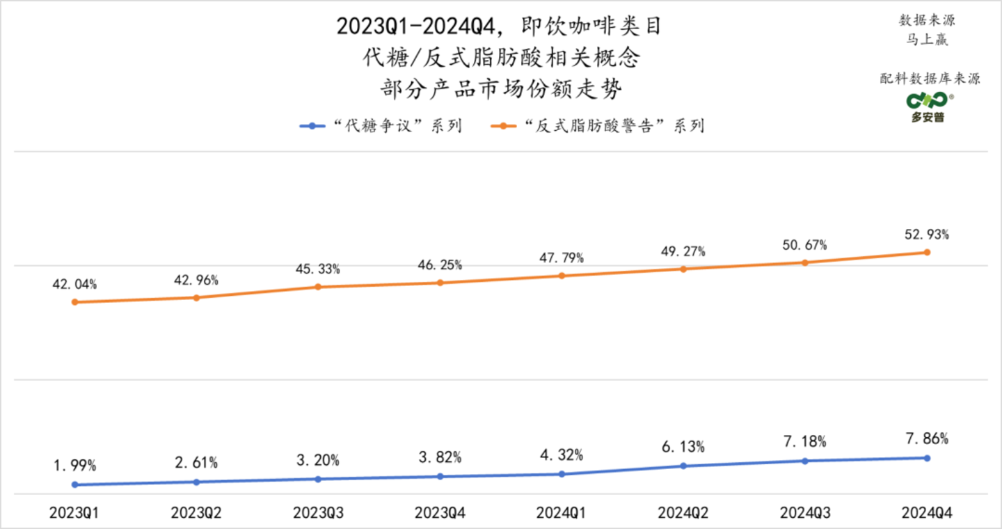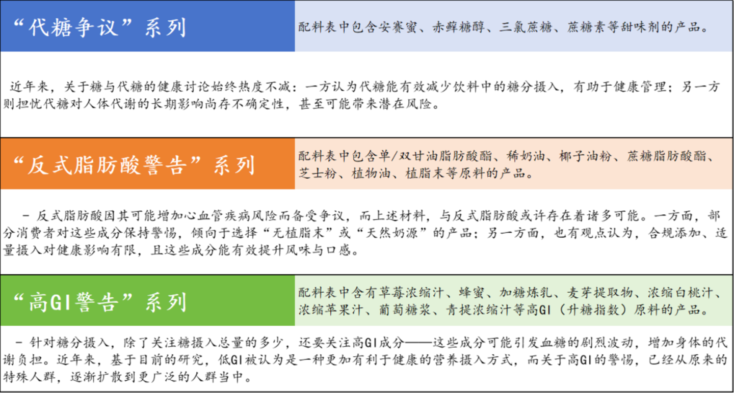 即饮咖啡类目少有涉及“高GI警告”系列原料的产品,聚焦即饮咖啡类目内,这部分产品(Top 20 SKU)中各原料概念相关产品在类目内的市场份额变化: