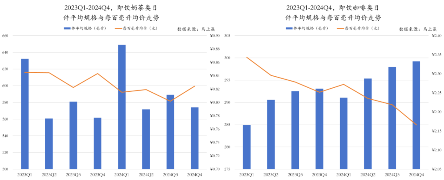 综合考察平均规格与每百毫升均价的变化,二者也呈现出类似的变化趋势。即饮奶茶的每百毫升均价整体呈缓慢下降趋势,而即饮咖啡的每百毫升均价则明显下滑,降幅接近10%。与此同时,两者的平均规格均有所上升,这或许与饮料市场整体向大包装化发展的趋势相吻合。