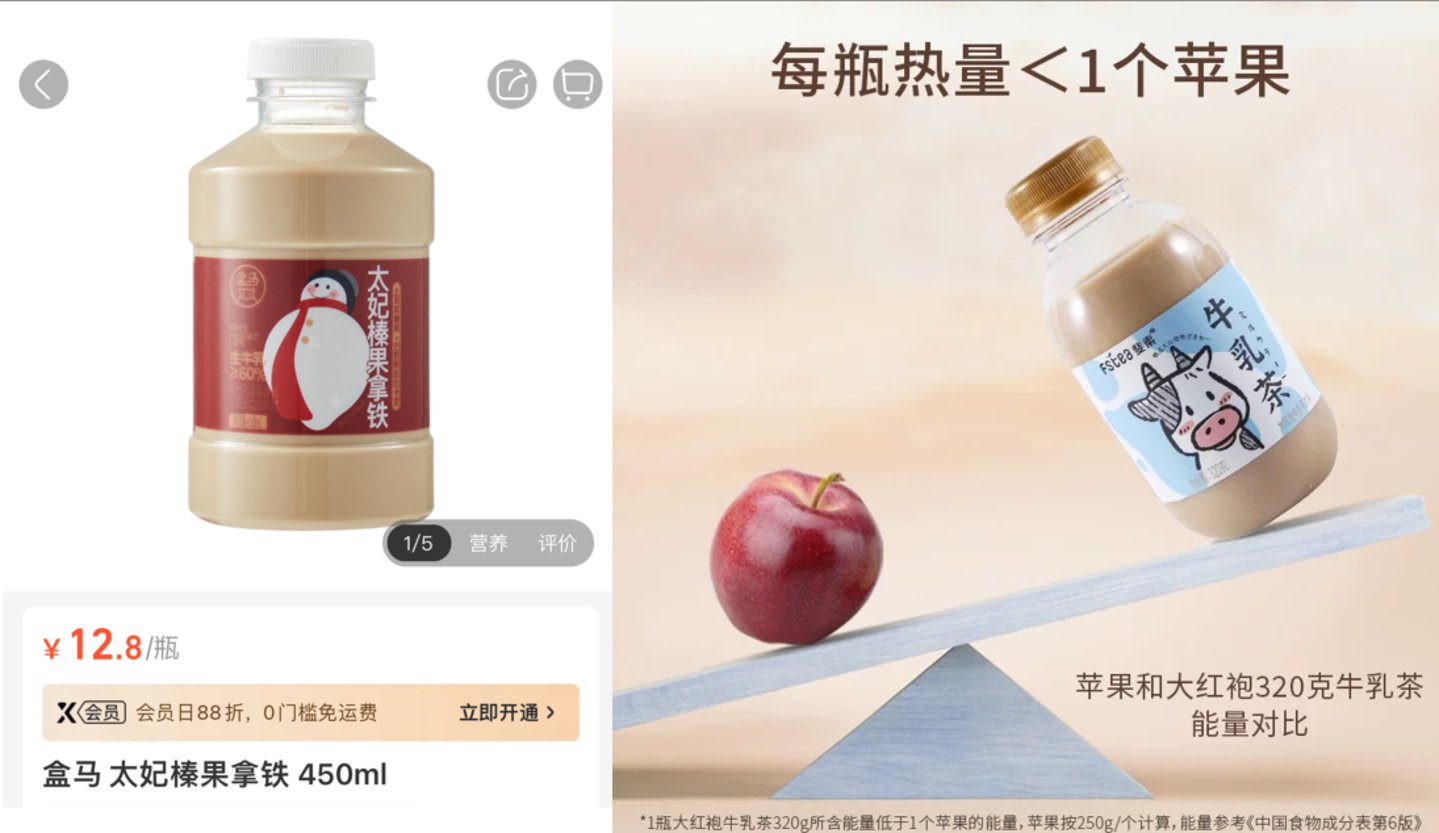 盒马太肥榛果拿铁、斐素大红袍牛乳茶(320g),图片来源:盒马APP、天猫@斐素饮品旗舰店