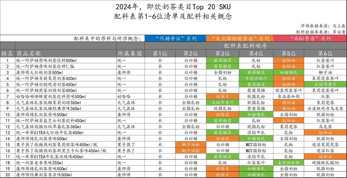 通过对即饮奶茶TOP 20 SKU配料表前六位配料的观察,我们可以看到: