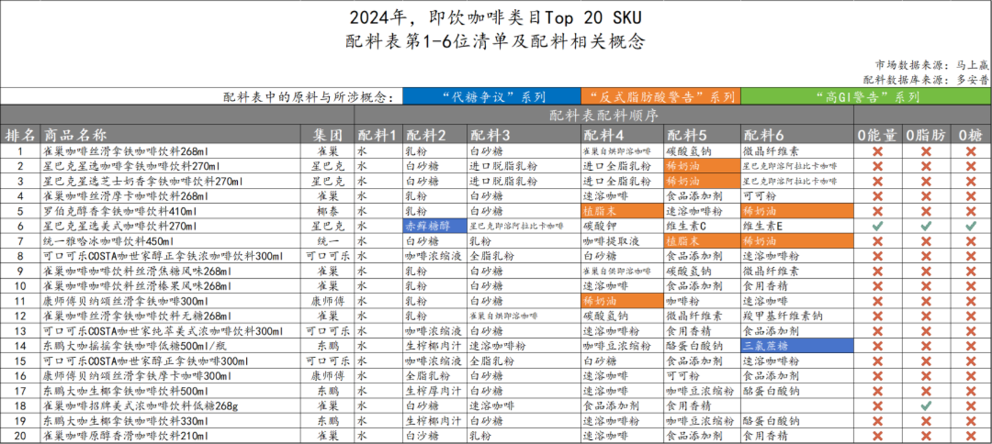 通过对即饮咖啡TOP 20 SKU配料表前六位配料的观察,我们可以看到: