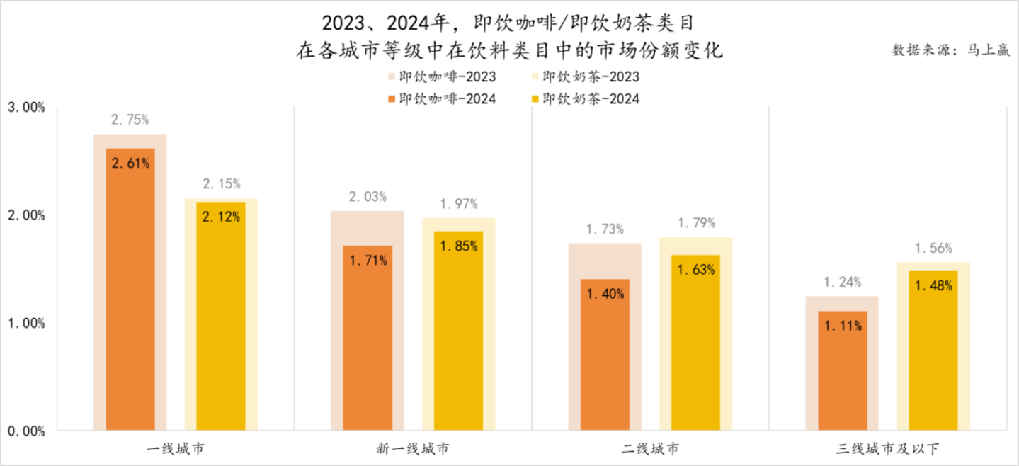 马上赢数据品牌CT中的数据显示,2024年即饮咖啡和即饮奶茶的市场份额在不同城市等级中均有所下降,其中新一线和二线城市的降幅相对更大,尤其是即饮咖啡,受到的冲击尤为明显。