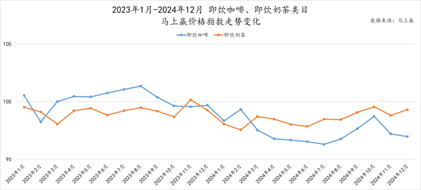 马上赢价格指数显示,在过去的两年中,即饮奶茶的价格整体呈下行趋势,而即饮咖啡的价格波动相对更为剧烈,在2023年经历了一段短暂的价格指数>100,价格水平呈现同比上涨后,在2024年则出现了更明显的下降,其下探深度较即饮奶茶更加明显。