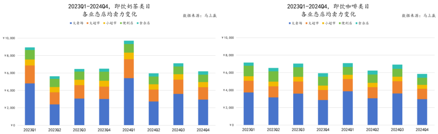 基于马上赢品牌CT中的数据,2023、2024年,即饮咖啡/即饮奶茶在各业态渠道的市场份额整体呈现下降,其中大卖场、大超市的即饮产品市场份额降幅相对较小,或表明即饮产品在这些渠道中,受现制饮品影响较小。
